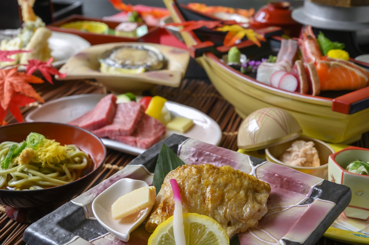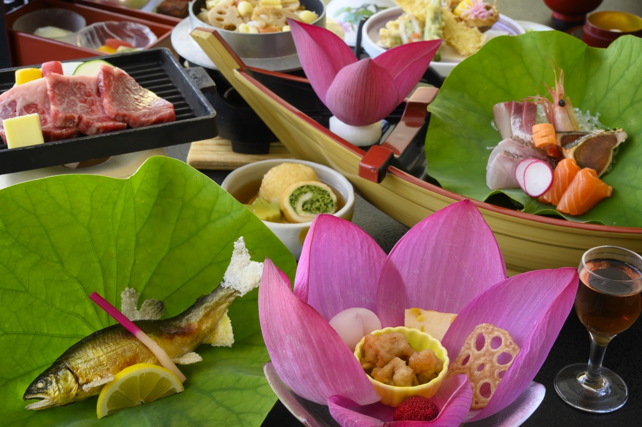 南越前町の温泉は、地下1000メートルから湧き出した肌にしっとりとまとう感じです。季節のお料理と、初夏には130種の花はすをお楽しみいただけます。