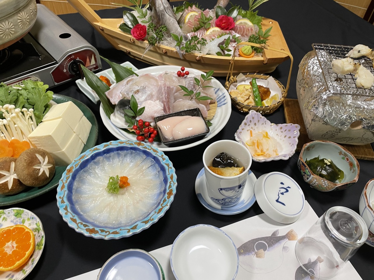 棚田と内浦湾に囲まれた小さな村です。築200年の建物には伊能忠敬も日本地図作成測量の際、一泊されました。目の前の海で養殖された若狭ふぐ。てっちり、てっさ、焼きふぐなど鮮度抜群です。コースでご用意致します。自家製野菜と共にお召し上がりください。