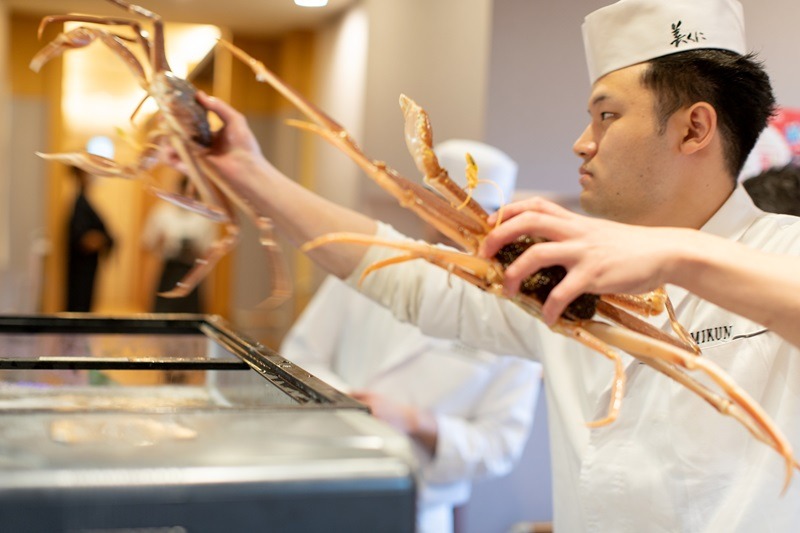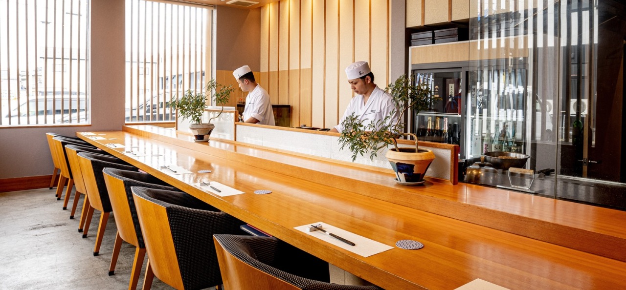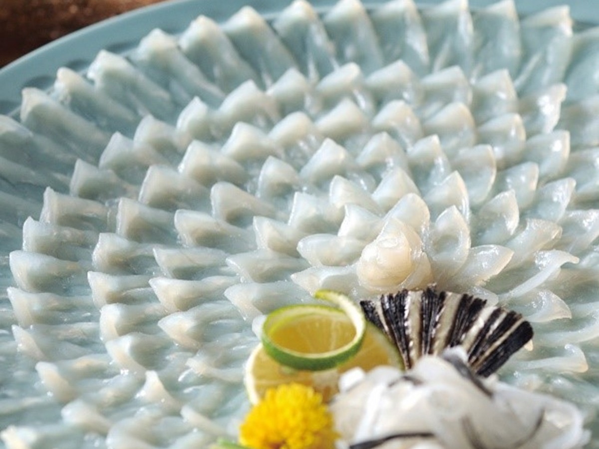 ふぐの中でも最も美味しく高級品と称されるふぐの王様「とらふぐ」。ふぐの養殖地で最も北限の若狭リアス式海岸一帯で養殖され、生産額全国六位を誇る日本屈指の産地です。3~5月の雪どけ水により、若狭一帯が低水温の期間が長いおかげで、他県にくらべて身のしまったきれいな身と旨みが評判です。当店では活物で仕入れ、ご予約時間に合わせてふぐ免許取得者の職人が責任を持って調理し、安全で美味しくご提供させていただきます。