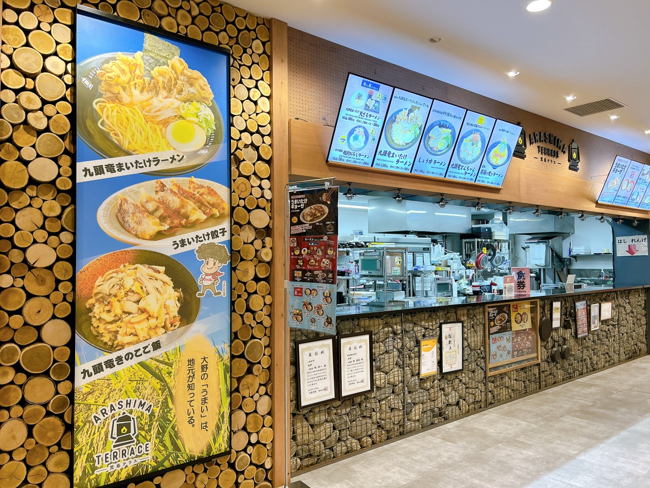 道の駅「越前おおの荒島の郷」内にあり、特産の「九頭竜まいたけ」ラーメンや、タレなしで食べられる「にんにく味噌味」の「九頭竜まいたけ」の餃子「うまいたけ餃子」、九頭竜まいたけや地元産の菌床しいたけなどが入った「九頭竜きのこご飯」などを提供している。「九頭竜まいたけ」の天ぷらも人気の一品。「九頭竜きのこご飯」と豚汁の各セットもございます。