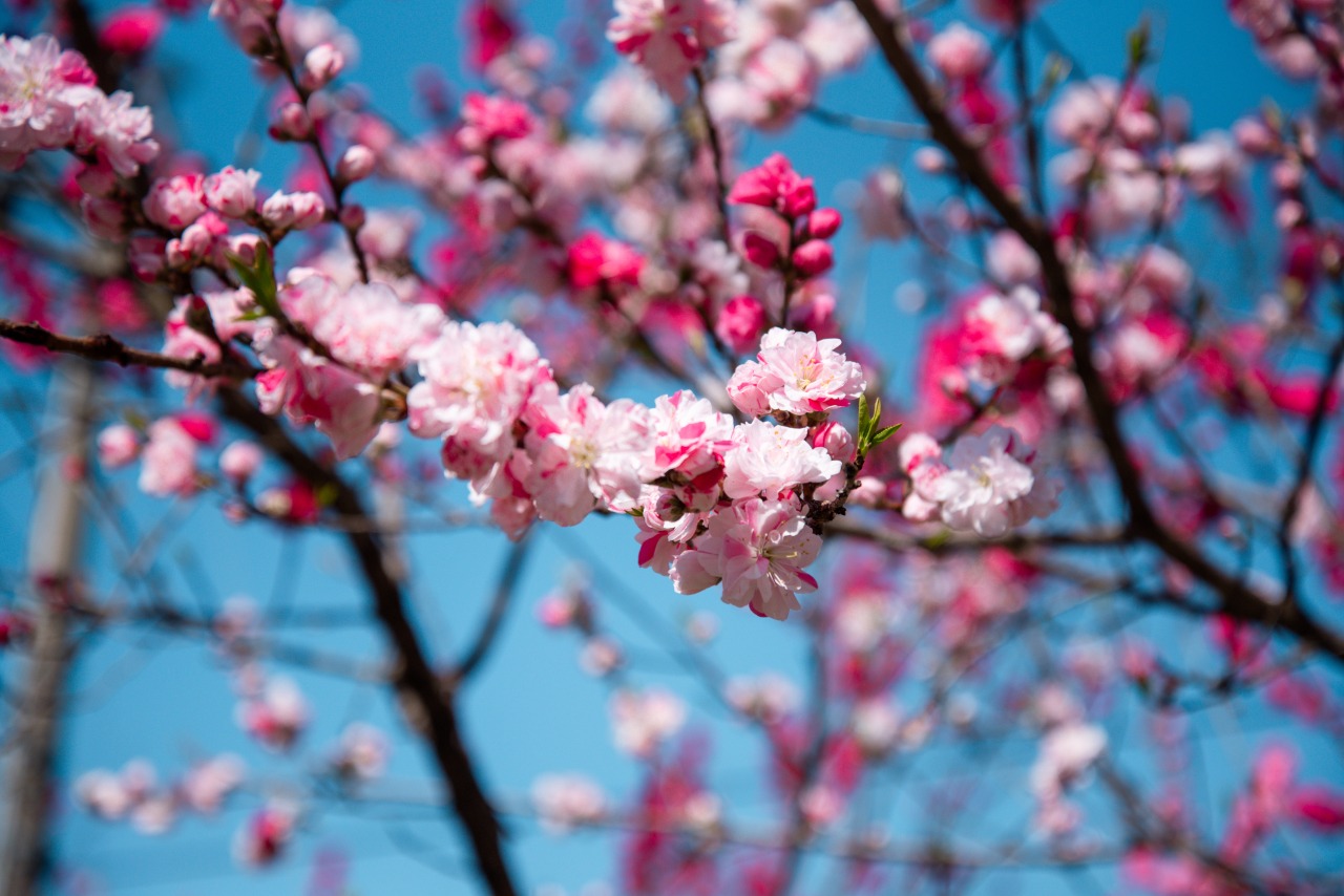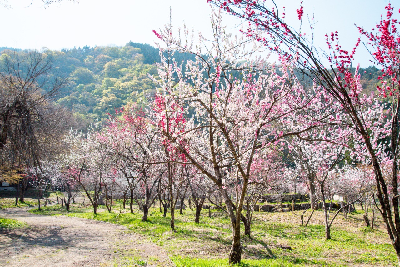 みずみずしい新録に染まる山々を背景に花桃が赤やピンク、白の花を咲かせる様子はまさに桃源郷です。