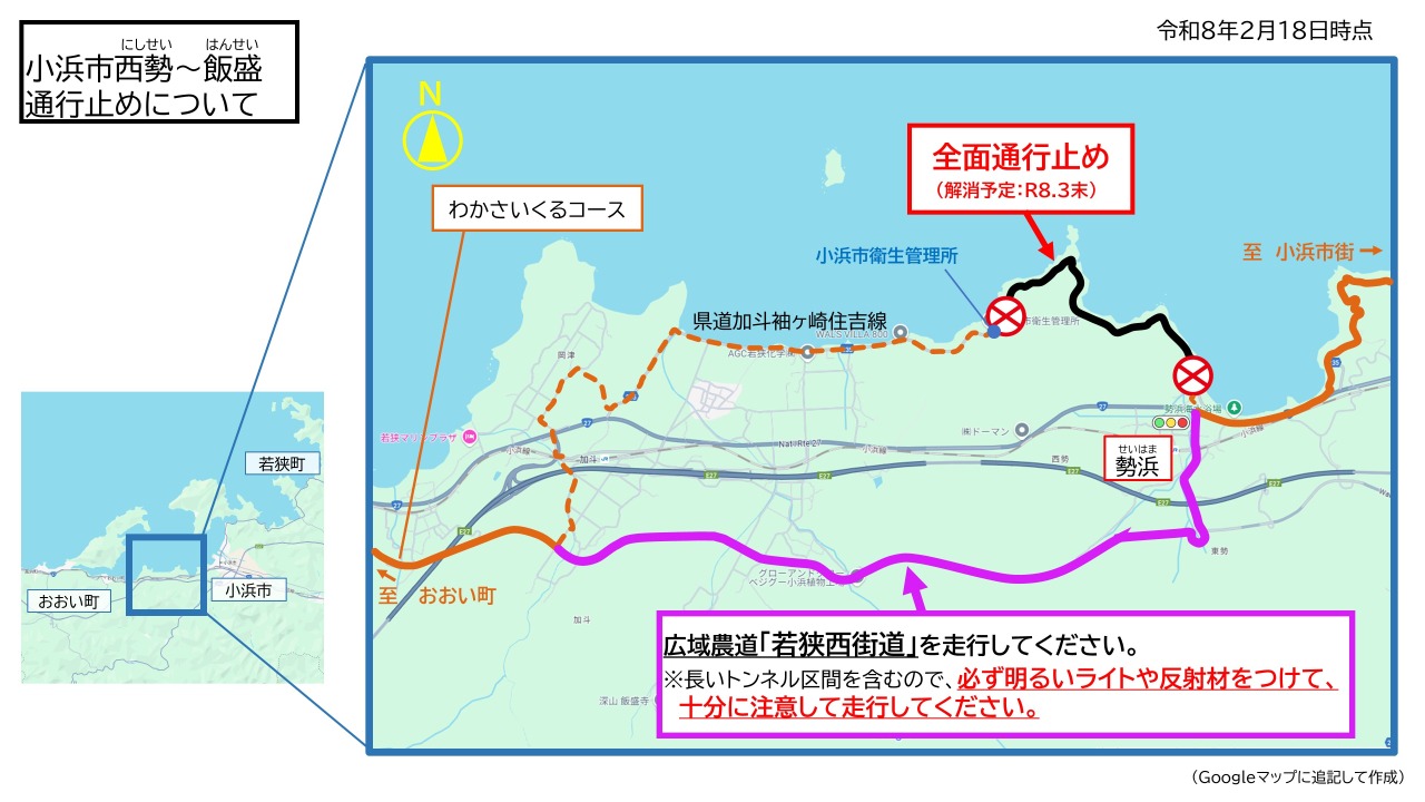 小浜市西勢(にしせい)~飯盛(はんせい)の県道加斗袖ヶ崎住吉線は、落石のため通行止めとなっています。