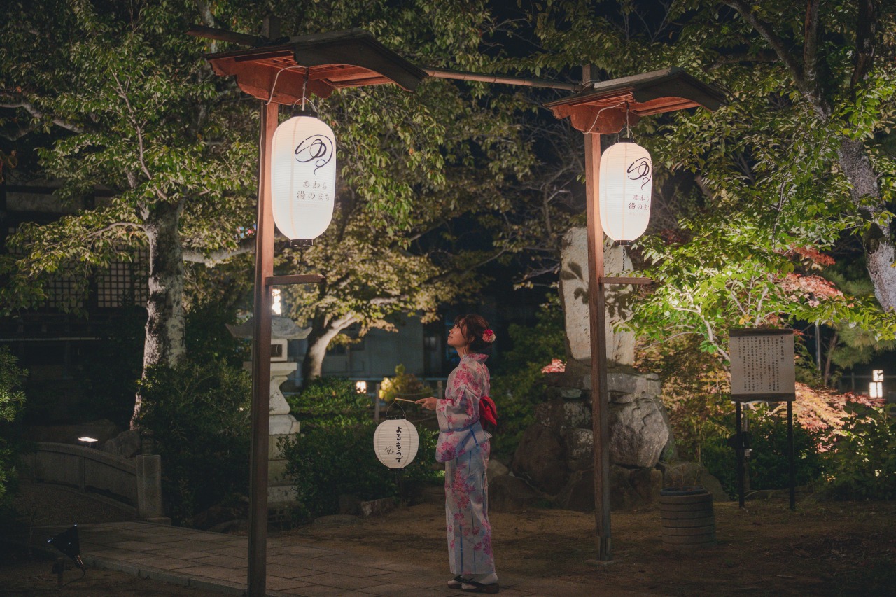 夜には、ライトアップされた薬師堂や薬師神社を巡る「よるもうで」も開催中。幻想的な夜の温泉街をぜひご体感ください。