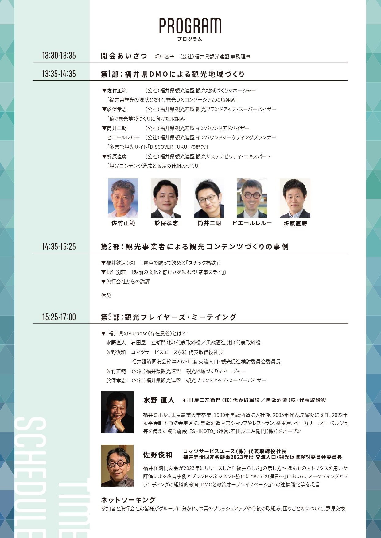第1部・第2部では観光事業者等による事例発表、第3部では「福井県のPurpose(存在意義)とは?」をテーマに、黒龍酒造(株)代表取締役 水野直人様と、福井経済同友会幹事2023年度交流人口・観光促進検討委員会委員長 佐野俊和様とのトークセッションを行います。