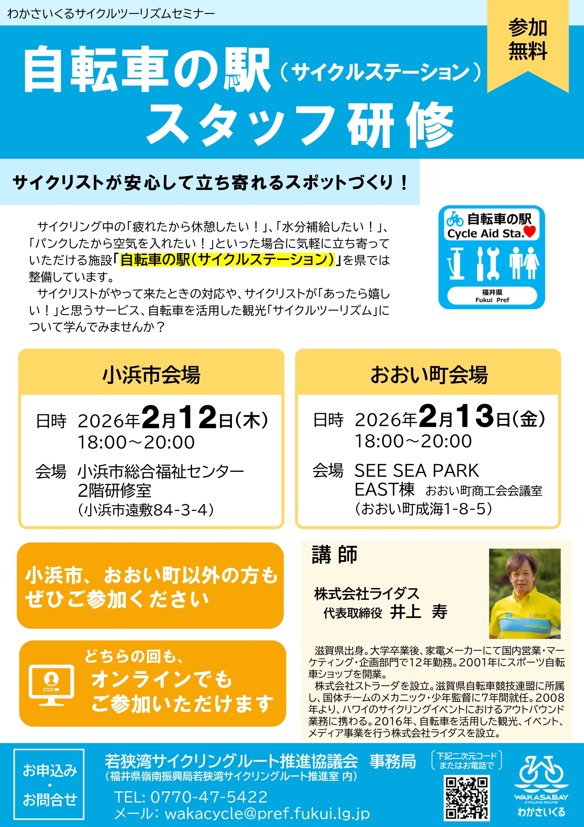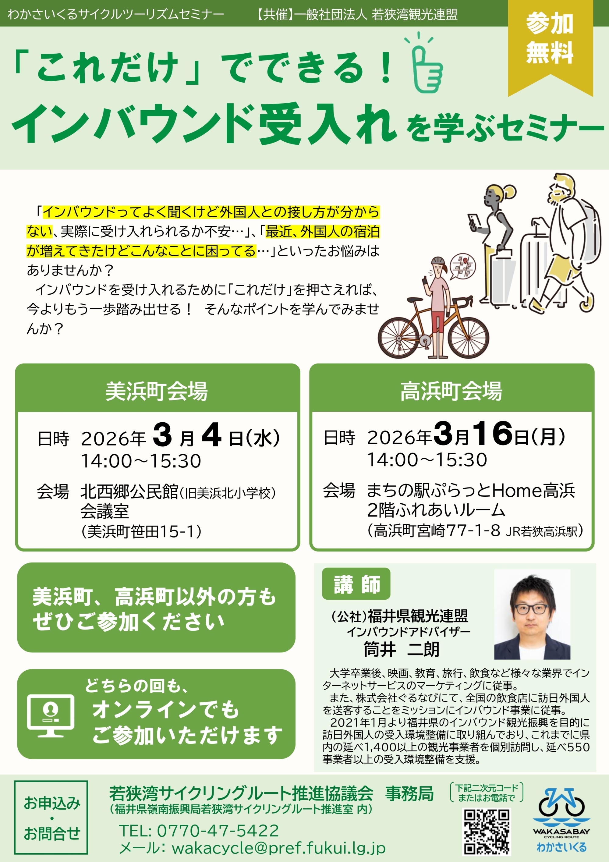 自転車を活用した観光「サイクルツーリズム」やインバウンドの受入対応について学ぶセミナーを嶺南各市町で開催します!
