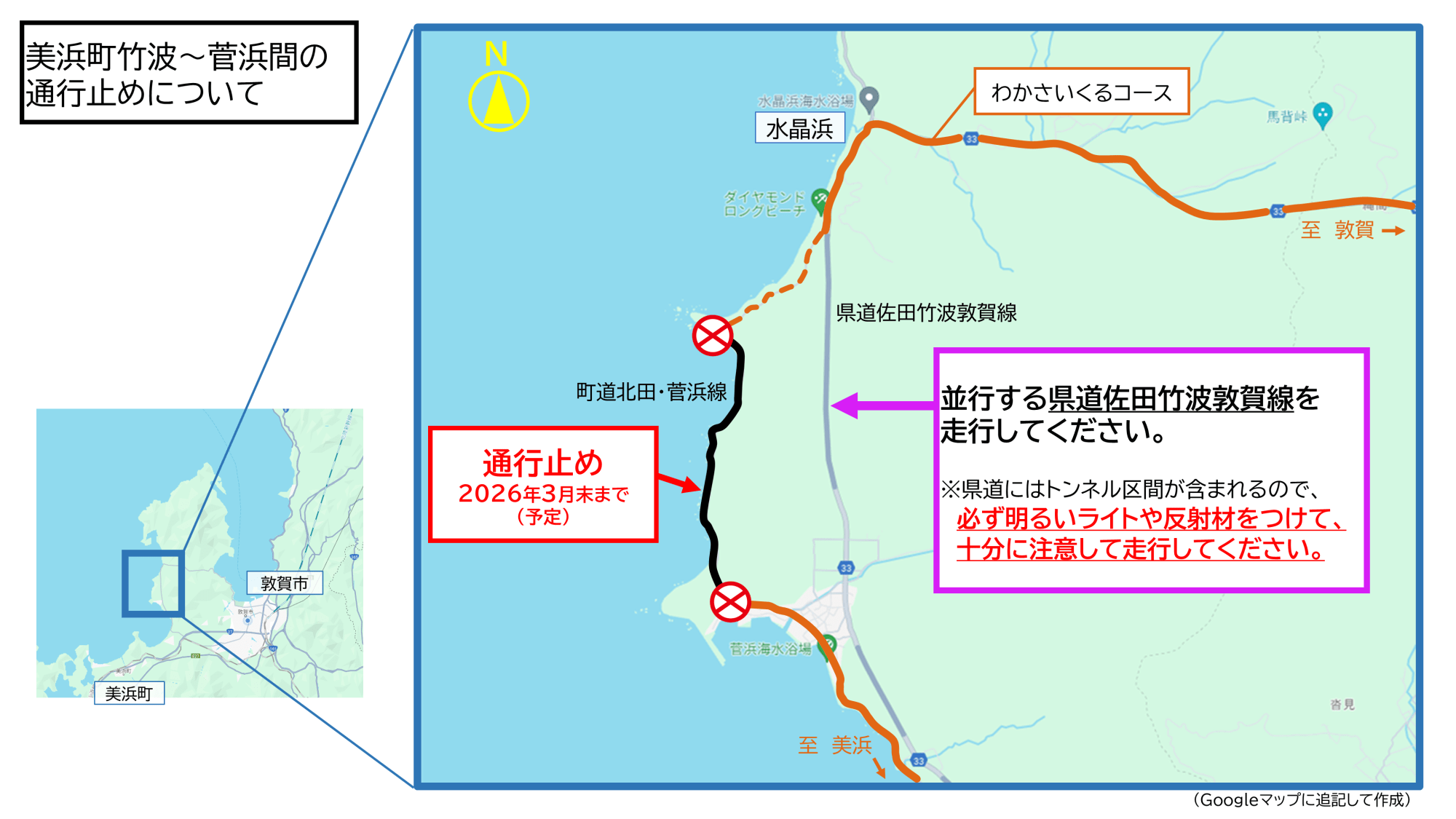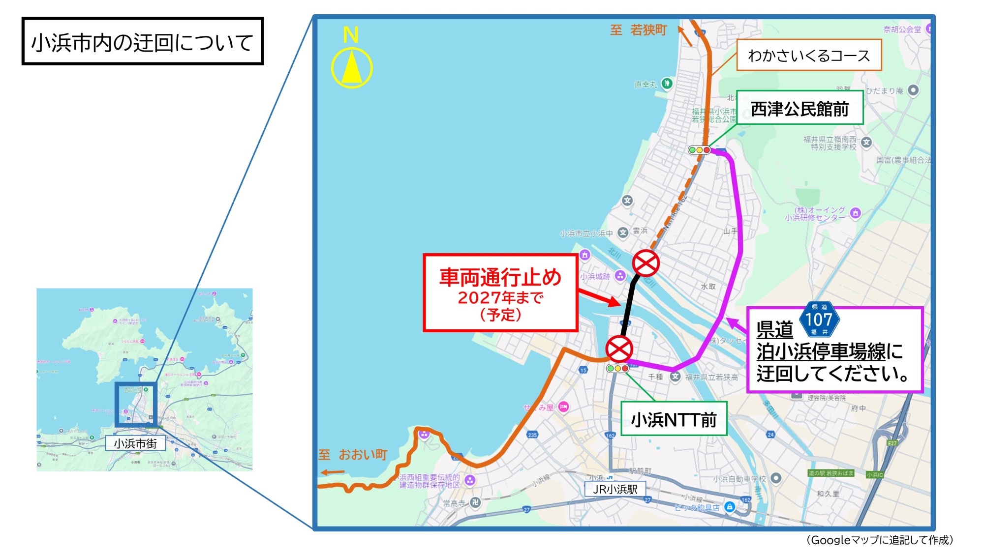 小浜市一番町~雲浜1丁目の部分には、2027年(予定)まで工事中の区間がありますので、県道泊小浜停車場線に迂回をお願いします。