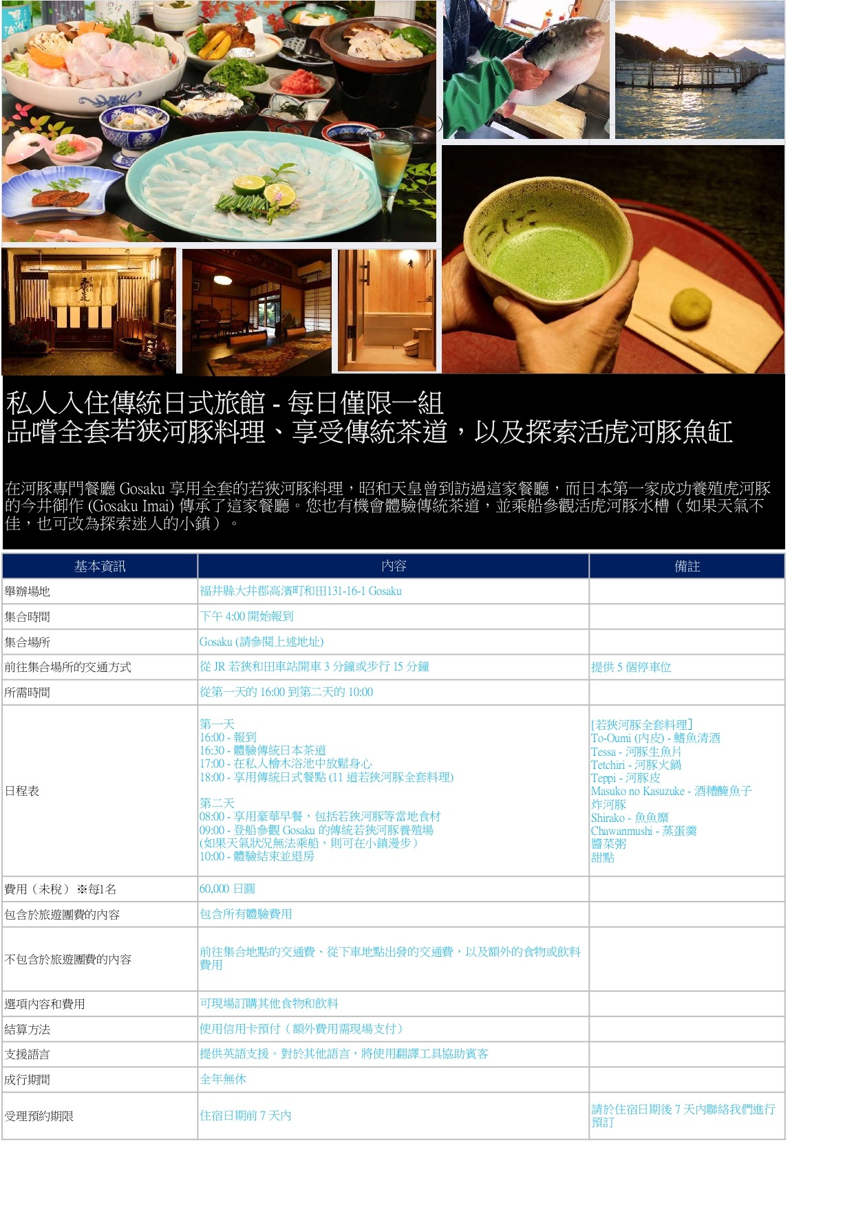 - 【繁體中文】66. 私人入住傳統日式旅館 - 每日僅限一組 品嚐全套若狭河豚料理、享受傳統茶道,以及探索活虎河豚魚缸
