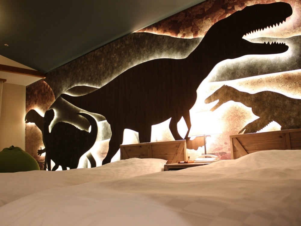 所謂「恐龍飯店」是以恐龍為主題待客的住宿設施。首先在大門入口即可看到恐龍迎賓,還有以恐龍為主題設計的恐龍客房,或是用許多恐龍玩偶、繪本裝飾的恐龍房型等。您可以在參觀完恐龍博物館後投宿恐龍飯店,繼續沈浸在看到恐龍的興奮餘韻中;或是先在恐龍飯店住一晚,再懷抱著雀躍的心情參觀恐龍博物館。