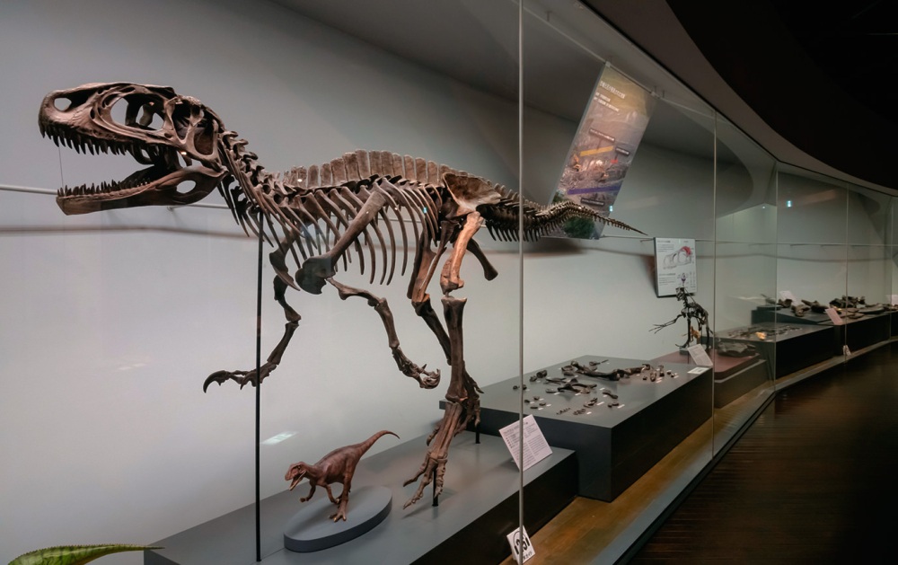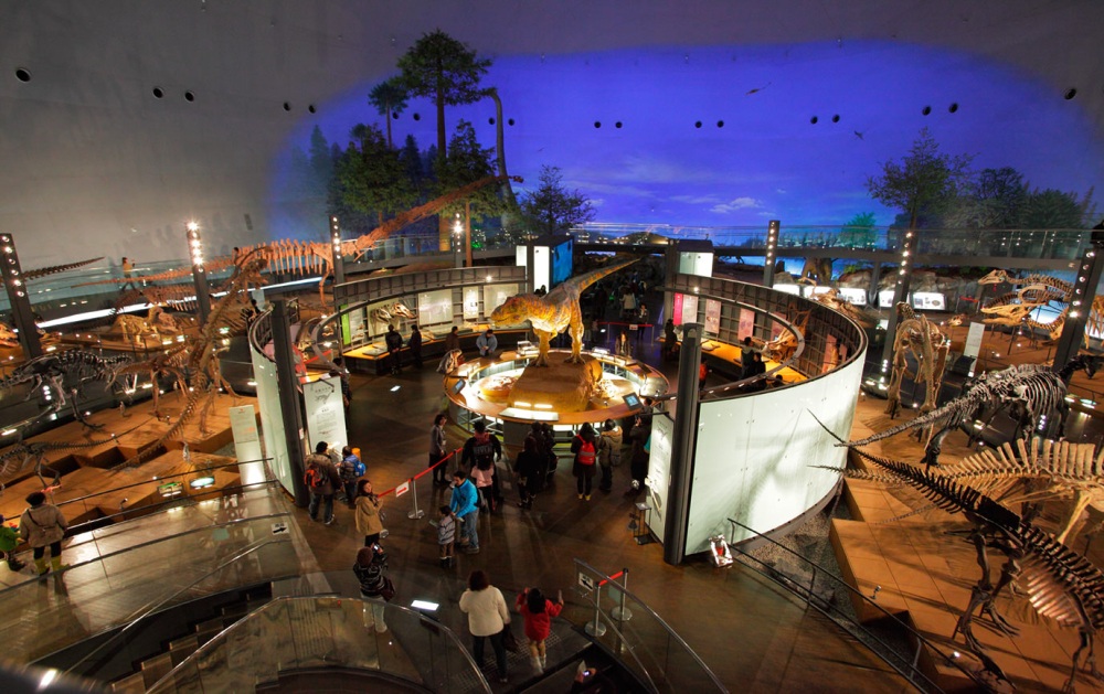 位於勝山市的福井縣立恐龍博物館是世界上數一數二的大型恐龍專門博物館,其建築物本身就曾獲頒知名獎項,招牌的銀色蛋形外觀刻意設計成半埋在地裡的模樣,踏入館內,先搭電扶梯直下地下三樓,來到佔地 4,500 平方公尺的展覽空間,參觀體驗由此展開。這裡展出超過一千件展品,包括 50 件恐龍骨骼和高如屋垣的化石足跡,還有立體實景活動模型和巨型放映幕,讓遊客能感受到這些古動物的大小比例。除了恐龍之外,館內也有以總體生命史甚至地球本身為主題的展覽。