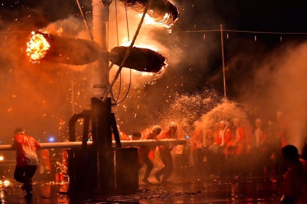 活動從下午開始,當地和國內其他地區的藝人們紛紛登臺獻技,帶來精彩的太鼓和夜來祭舞表演。活動現場的小吃攤和市集販賣燒烤點心和繽紛糖果,吸引眾多遊客紛至沓來。參加者整個下午都可以在大火勢上寫下鼓勵的話語,為晚上的表演做好準備。天色漸暗時,一支火炬遊行隊伍會從鎮中心出發,一路來到大火勢舞臺。參加者點燃草捆,升起並轉動大火勢。活動結束時,絢麗的煙花會在海灣上空綻放。