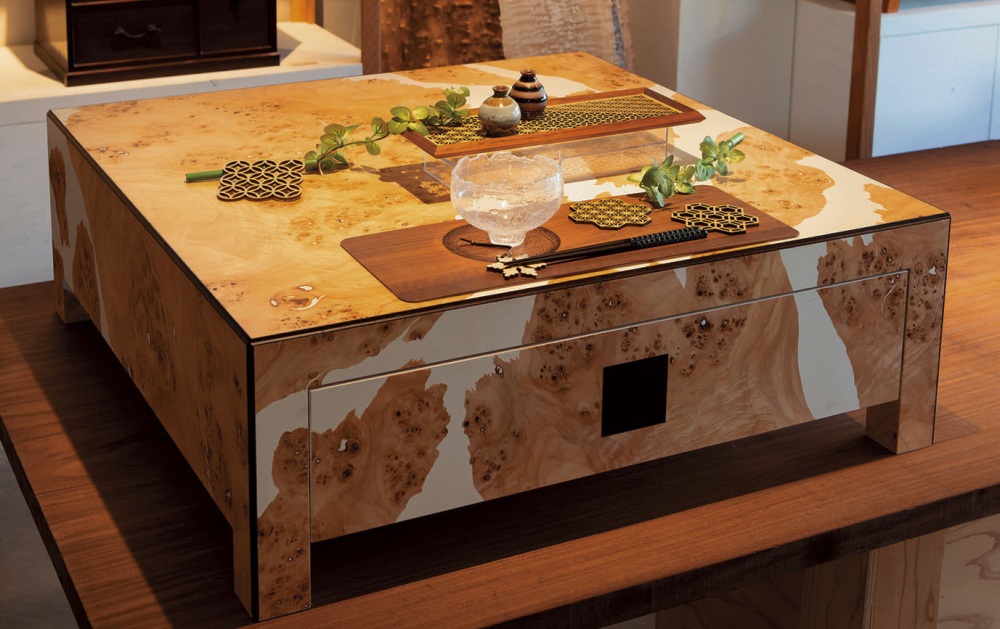 這種傳統斗櫃看起來莊重嚴肅,不過有一家名為 Furnitureholic 的工坊就在新近的設計中增添了玩趣,他們將製作簞笥的技巧應用在其他用途,例如改用彩色鐵件、加上滑桿和輪子,簞笥便搖身一變成為滑輪行李箱。Furnitureholic 也和其他越前匠師有過各式各樣的合作,例如使用「指物」榫接法製作拐杖,再經越前漆藝塗裝,或是在文具木盒上以越前和紙裝飾。