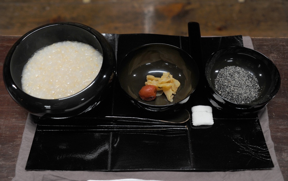 每頓餐食結構相同:早餐為稀飯和醬菜。 午餐是米飯、湯、醬菜再增加一樣菜。 晚餐與午餐類似,但會有兩樣菜餚。